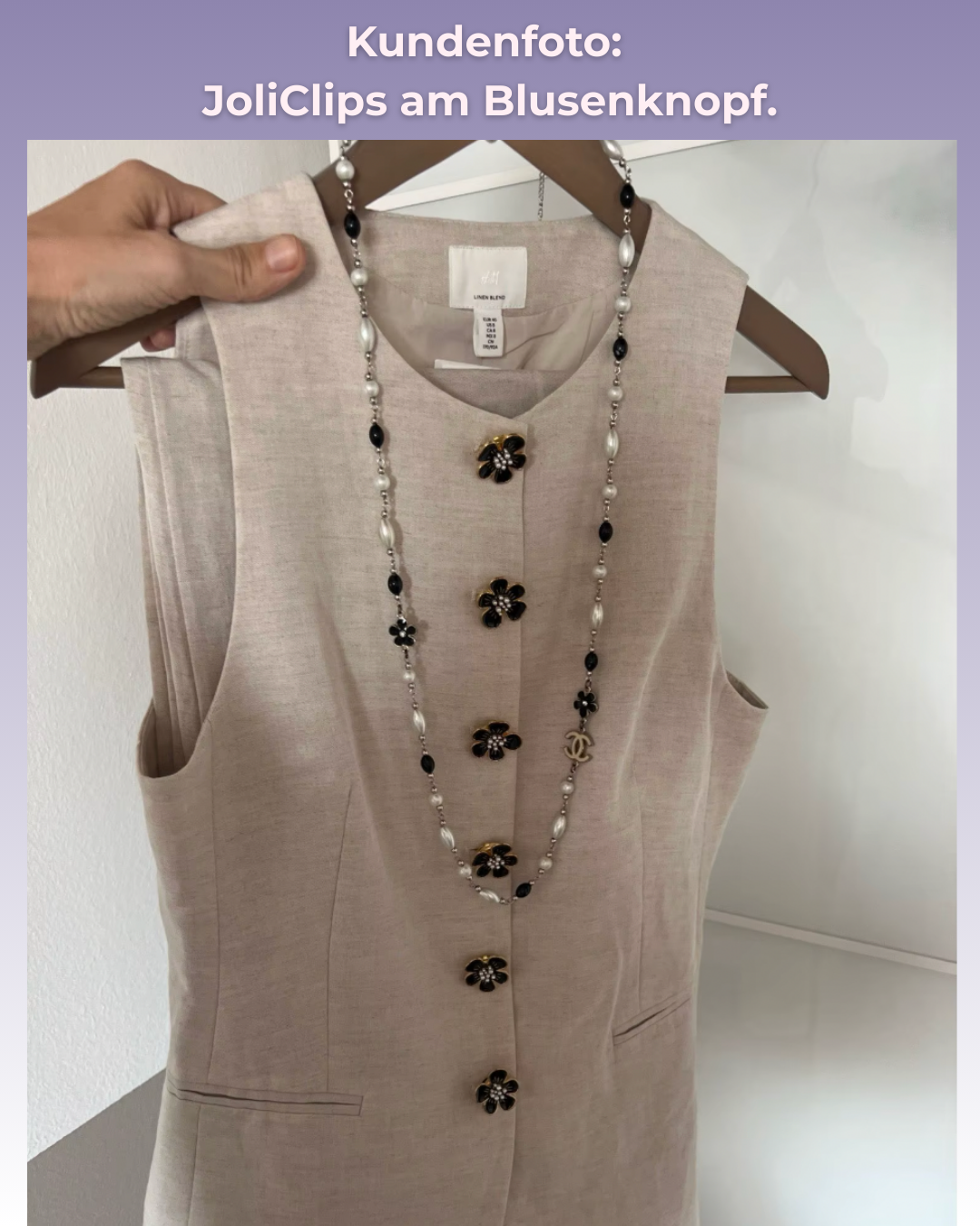 JoliClip ist der Knopfschmuck, den du immer gesucht hast. Er verwandelt jeden gewöhnlichen Knopf in einen luxuriösen Hingucker, ohne dass du dafür extra Hand anlegen musst. Mit unserem innovativen Clip-System kannst du deine Knöpfe ganz einfach in stilvolle Accessoires verwandeln, die deinen Look aufwerten und ihn gleichzeitig einzigartig machen.